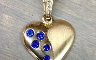 Näiden korujen materiaali sulatettiin asiakkaamme Helin vanhoista kultakoruista. Kaikki kivetkin ovat uudelleen käytettyjä. Heli halusi säilyttää muistot ja teettää itselleen ja lapselleen persoonallisia koruja. Hän suunnitteli korut Hannun kanssa valmistimme upeat korut käsityönä.