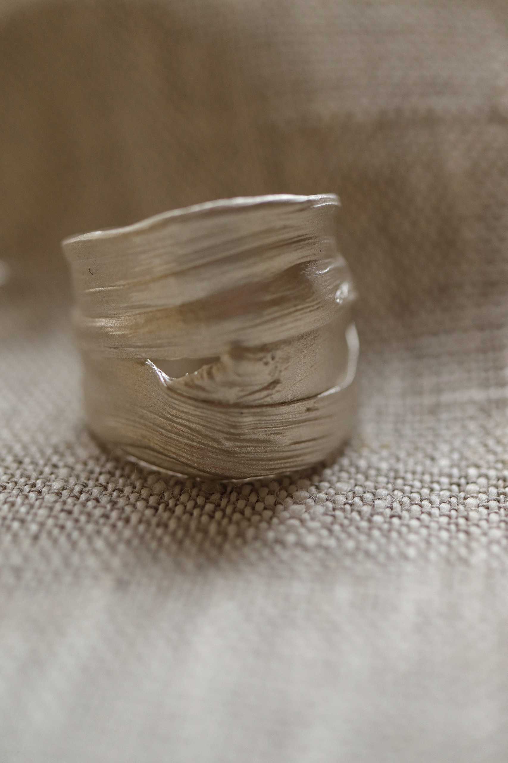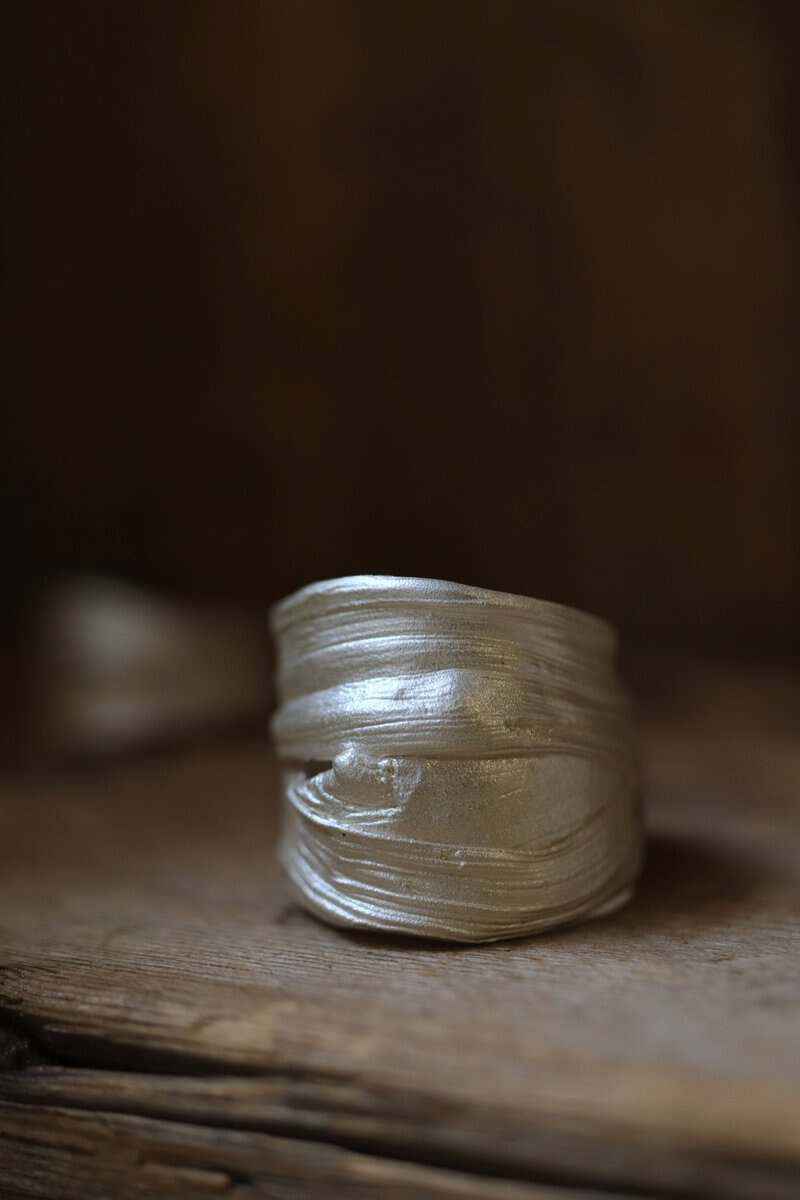 Koru on valmistettu kierrätyshopeasta 925. Sormuksen leveys edestä 21mm, takaa 10,2mm.